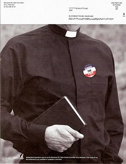 A recent postcard mailed the the MN DFL State Central Committee has a picture of a priest wearing a button that says "Ignore the Poor".